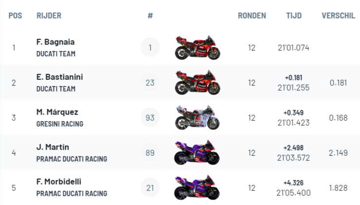 Vervolgens sloeg echter het noodlot toe voor Acosta, die in de negende ronde bij het insturen van bocht 9 tegen de vlakte ging en zo zijn eerste sprintzege door de vingers zag glippen. Het bracht Bagnaia aan de leiding, die hij in het restant van de race niet meer zou afstaan – ondanks dat hij in de slotronde meer dan een seconde verloor op de achtervolgers. De Italiaan boekte zijn derde opeenvolgende sprintzege, op twee tienden gevolgd door teamgenoot Bastianini. De Ducati-rijder won het duel met Márquez om de tweede plek, terwijl Martín in niemandsland als vierde over de finish kwam en zo een voorsprong van vijftien punten behield in de titelstrijd.