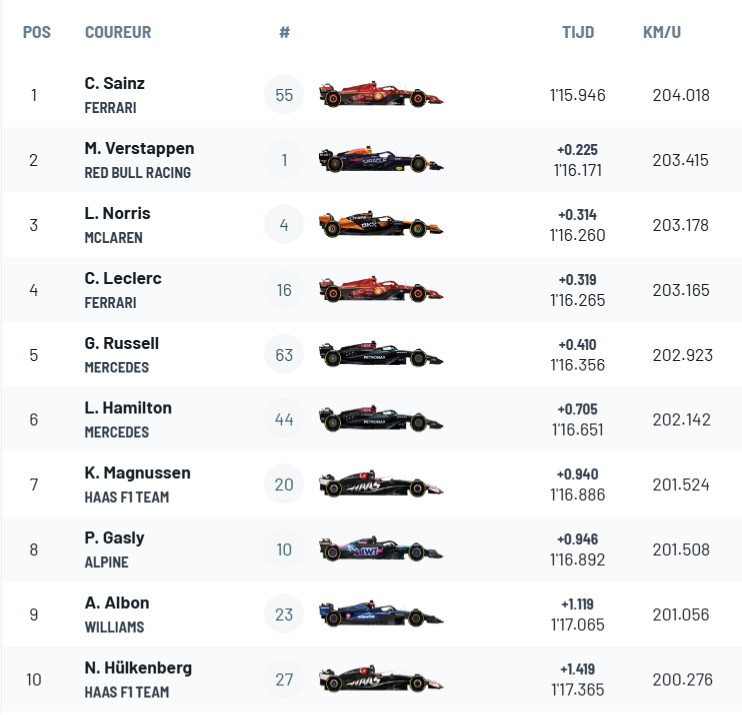 Voor Verstappen kwam derhalve alles op de tweede en ook meteen laatste runs aan. Ferrari opende het bal ditmaal en legde de lat nog maar iets hoger. Leclerc redde dat door vele momentjes van overstuur niet, maar Sainz snoepte nog maar eens een tiende van zijn eigen toptijd af. Een soeverein optreden van de Spanjaard, die volledig terecht de polesitter zou blijken. Daarna gingen alle ogen op Verstappen, die in ieder geval een tijd moest noteren om zondag een fatsoenlijke uitgangspositie te hebben. Hij leverde echter met verve in de enige overgebleven Red Bull door beslag te leggen op P2. De wereldkampioen bleef daarmee zelfs zijn titelrivaal Lando Norris nog voor, die genoegen moest nemen met P3. Leclerc zakte door een lastige laatste ronde naar P4, voor het Mercedes-duo onder aanvoering van Russell. Magnussen, Gasly, Albon en Hülkenberg maken de eerste tien op de grid van zondag compleet.