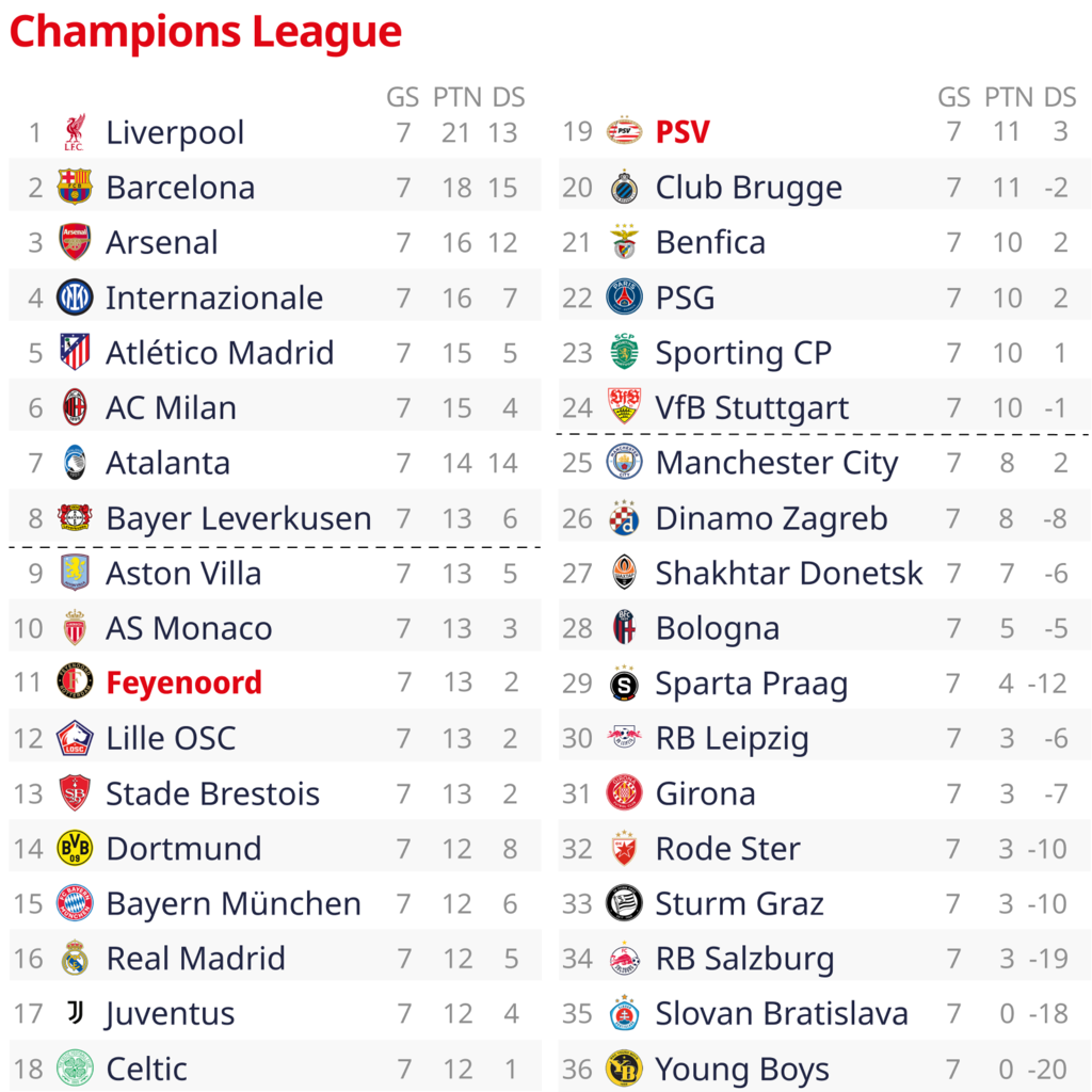 Door de nederlaag zakte Bayern naar de vijftiende plek op de ranglijst. De Duitse grootmacht sluit de groepsfase van de Champions League volgende week af met een thuiswedstrijd tegen laagvlieger Slovan Bratislava.