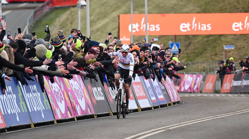 In de laatste ronde van zijn thuiscross in Hoogerheide stunt Van der Poel zondag op een bruggetje even met zijn achterwiel. In de oplopende finishstraat, waar hij twee jaar geleden Wout van Aert versloeg in een spannende sprint om de wereldtitel, heeft hij nu alle tijd om high fives uit te delen aan het publiek.