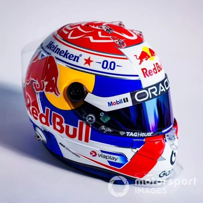 Zo is er bovenop de helm een rode streep toegevoegd aan de zogenaamde ‘sponsorhalo’, waarmee de Nederlandse vlag meer opvalt. Daarnaast zijn een aantal sponsornamen aangepast: EA Sports is van de kin verwijderd en vervangen door Gate.io, terwijl het Heineken 0.0-logo nu de hele sponsorbanner bedekt, in plaats van de oude tekst ‘Player 0.0’, een initiatief van Verstappen.