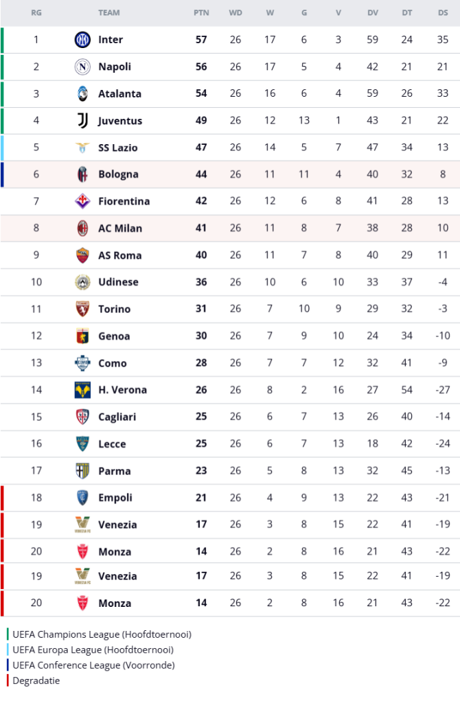 Met nog twaalf wedstrijden te spelen lijkt de landstitel voor Milan buiten bereik, aangezien de club acht punten achterloopt op nummer vier Juventus, een positie die recht geeft op deelname aan de Champions League. Het volgende duel van Milan staat zondag op het programma tegen nummer vijf Lazio.