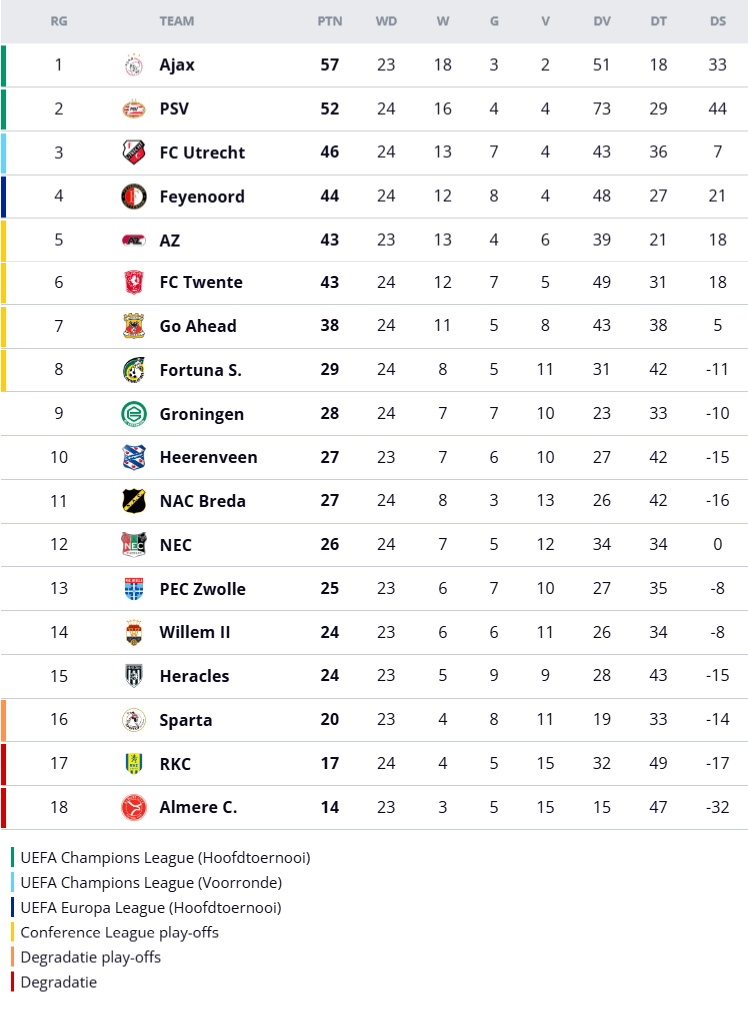 Standenlijst Eredivisie: