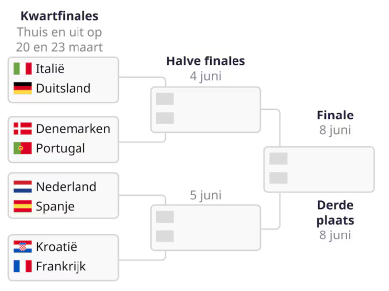 De winnaar van dit tweeluik treft in juni in de halve finale Frankrijk of Kroatië, waarbij de Kroaten een 2-0 voorsprong hebben uit de eerste ontmoeting.