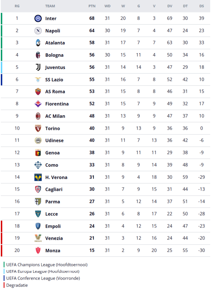 Eerder op de dag verloor Atalanta met 0-1 van Lazio, wat de kansen van de ploeg van Marten de Roon om mee te strijden voor de titel verder verkleint. Atalanta staat nu tien punten achter koploper Internazionale, wat hun titelambities vrijwel onmogelijk maakt.