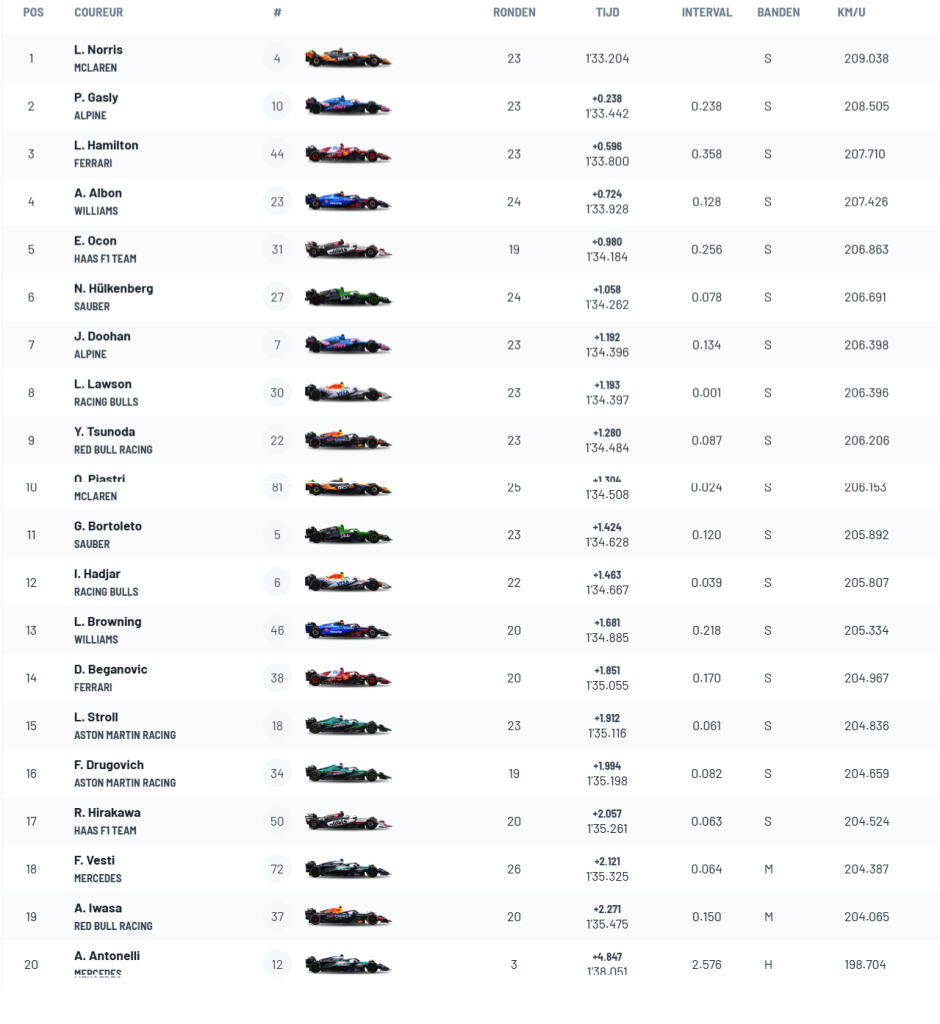 Gabriel Bortoleto, Nico Hülkenberg en Oscar Piastri waagden zich aan snelle pogingen, maar het was uiteindelijk Norris die op de softs foutloos rondging en de eerste plek overnam. Pierre Gasly klokte de tweede tijd met 1:33.442 en Lewis Hamilton completeerde de top drie met 1:33.800.