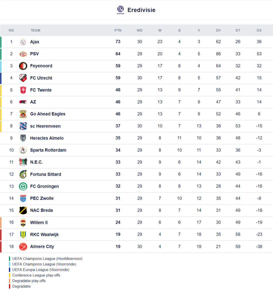 De Domstedelingen mogen zelfs nog hopen op de voorrondes van de Champions League. Met vier wedstrijden te gaan ligt alles nog open.