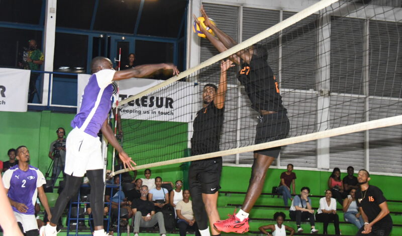 Yelyco-aanvaller David Pinas smasht de bal langs het blok van Timothy Lamsberg (27) van Livo. Foto: John Zaalman