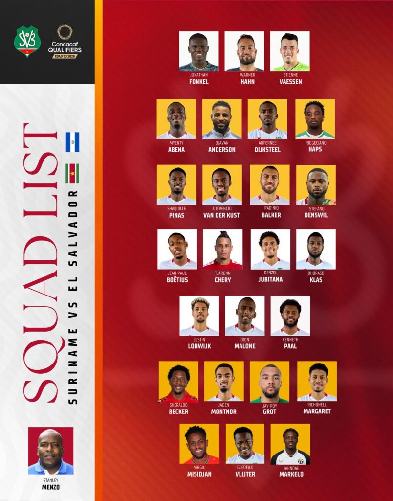 Bondscoach Stanley Menzo heeft de selectie van Natio bekendgemaakt voor de twee aankomende WK-kwalificatiewedstrijden. Suriname speelt op 13 november in het Franklin Essed Stadion tegen El Salvador, en reist vervolgens vier dagen later af naar Guatemala voor de beslissende uitwedstrijd.